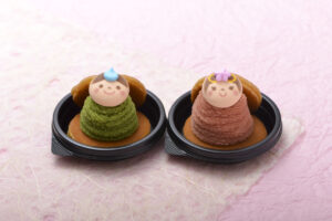お内裏様とお雛様が並ぶ、菱餅カラーのいちごミルクムース。