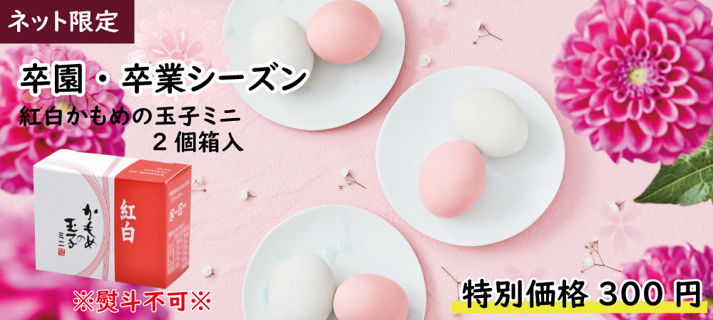 卒業や卒園など、節目のお祝いにご好評をいただいております 「かもめの玉子ミニ(2個入箱)」を、今だけの特別価格、324円のところ 300円(税込)にてご用意いたしました。