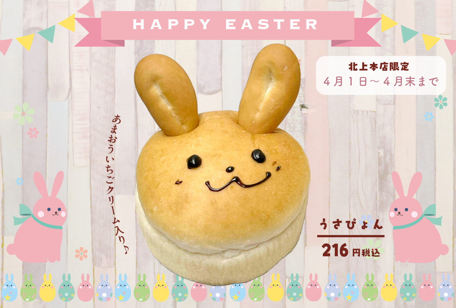 北上本店の「パン工房ここあ」では、4月5日の「イースター」にもおすすめな、可愛らしいうさぎのキャラクターパンを販売します🐇